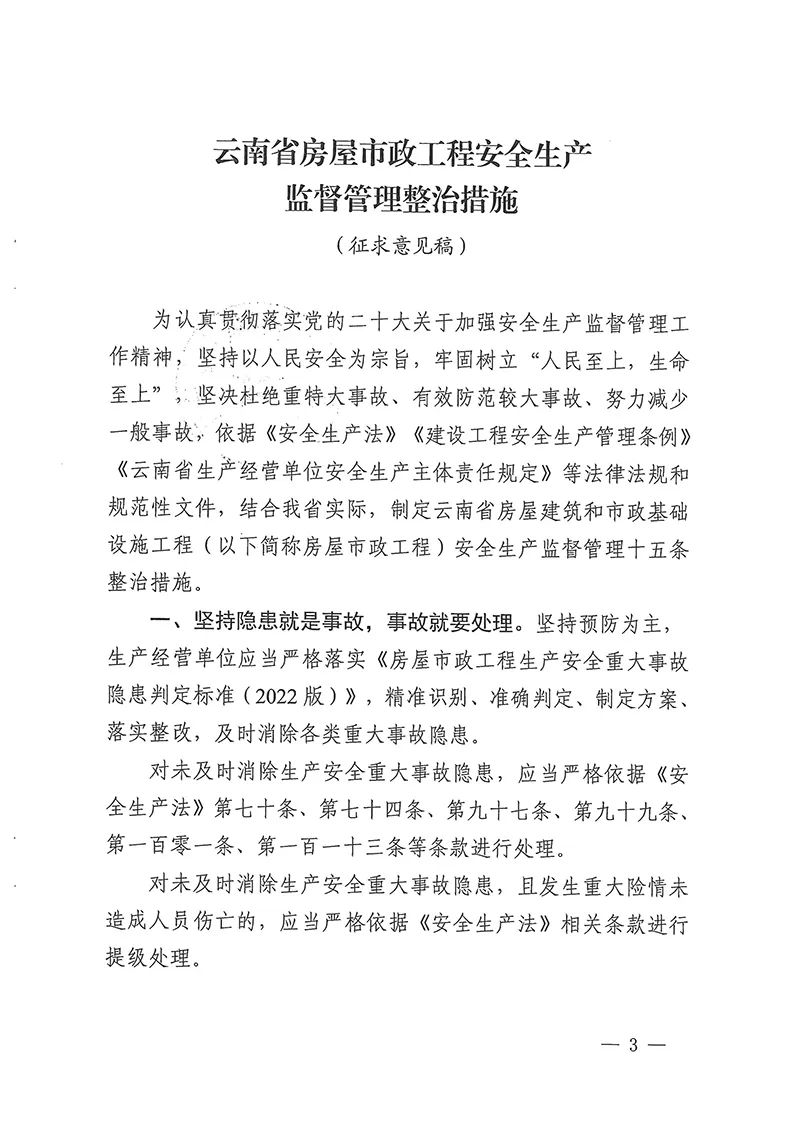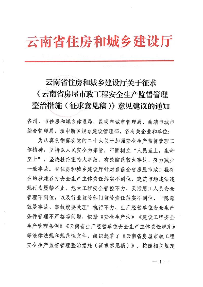 云南省住房和城鄉(xiāng)建設(shè)廳關(guān)于征求 《云南省房屋市政工程安全生產(chǎn)監(jiān)督管理整治措施(征求意見稿)》意見建議